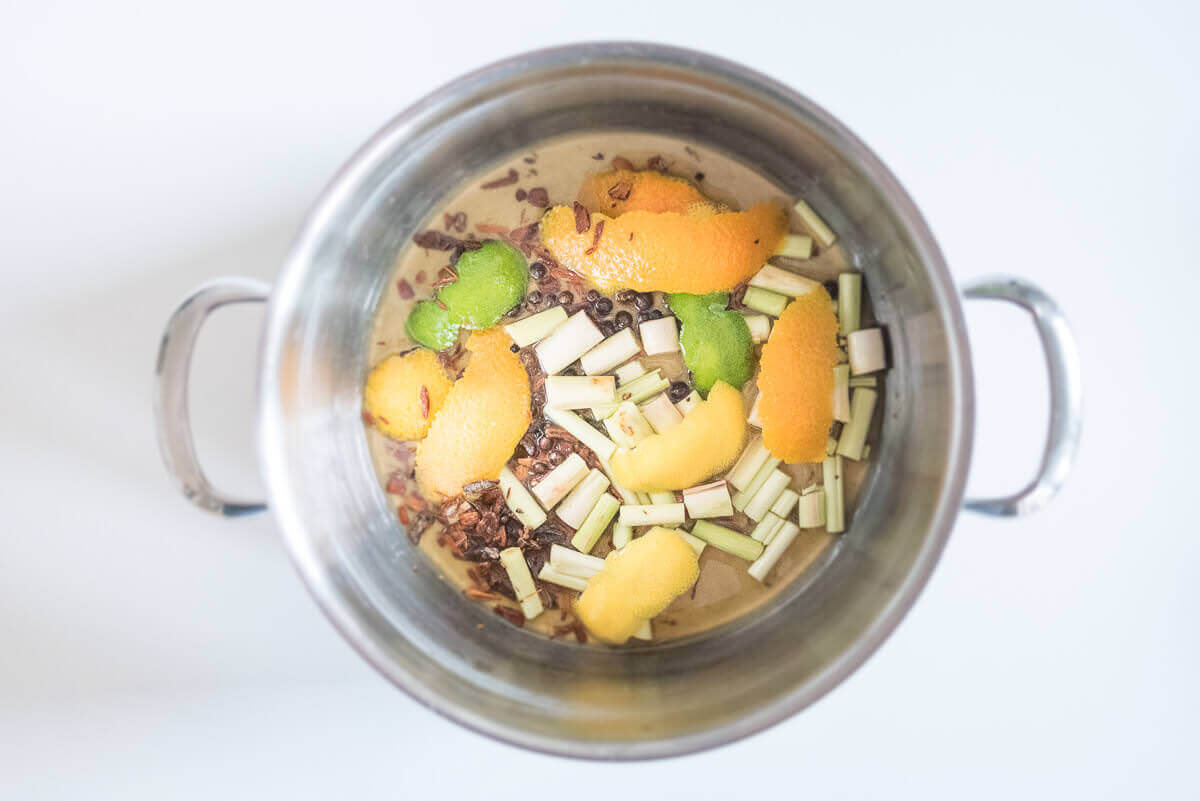 Zu Beginn wiege ich bis auf den Zucker alle Zutaten ab, schneide sie klein und gebe sie zusammen in einen großen Topf. Ich gieße einen Liter Wasser dazu, koche das Ganze kurz auf und lasse es dann eine halbe Stunde auf kleiner Hitze ziehen. Das Wasser verfärbt sich dabei dunkelbraun, das kommt durch die verwendete Chinarinde.