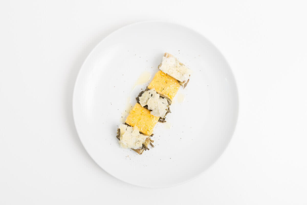 Ich habe die einzelnen Pflanzen vorsichtig aus dem Glas gelöst und unter fließendem Wasser gründlich vom Essig befreit. Dabei kann man das Grün auch mal kräftig auswringen. Nach einer kurzen Trockenzeit habe ich den Radicchio in bestem Olivenöl gebadet und ihm anschließend eine Zudecke aus Käse spendiert. Hier eignen sich besonders die kräftigen, sehr würzig-reifen Käsesorten aus eben der Gegend, die auch das Gemüse beheimatet. Also Bagòss, alte Granas oder – wie in meinem Fall – der einzigartige „Nostrano Lodrone“, ein Käse aus dem Trentino, so würzig wie eine ganze Alpenkräuterwiese. Die kleine Skulptur aus Gemüse, Käse und Öl kommt jetzt in den Kühlschrank und darf dort lange und intensiv durchziehen. Ich koche noch etwas Polenta dazu, ebenfalls ein typisches Gericht aus den norditalienischen Bergen und lasse auch sie abkühlen.